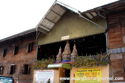 วัตถุมงคลบนศาลาการเปรียญไม้หลังงาม อันมีพระเจดีย์สามองค์ประดิษฐานอยู่เหนือประตูทางเข้า